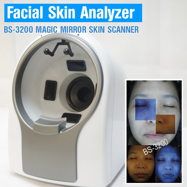 the BS-3200 system is a self-contained unit that captures multi-spectral photos of the face, examining the complexion for wrinkles, spots, pores, texture, porphyrins (evidence of bacteria in pores), UV spots (characteristic of photodamage, typically from overexposure to sun), pigmented spots and acne. Additionally, it grades an individual’s skin features relative to others of the same age and skin type.